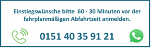Ein Einstiegswunsch bitte telefonisch oder per WhatsApp 60 – 30 Minuten vor der fahrplanmäßigen Abfahrtszeit anmelden.